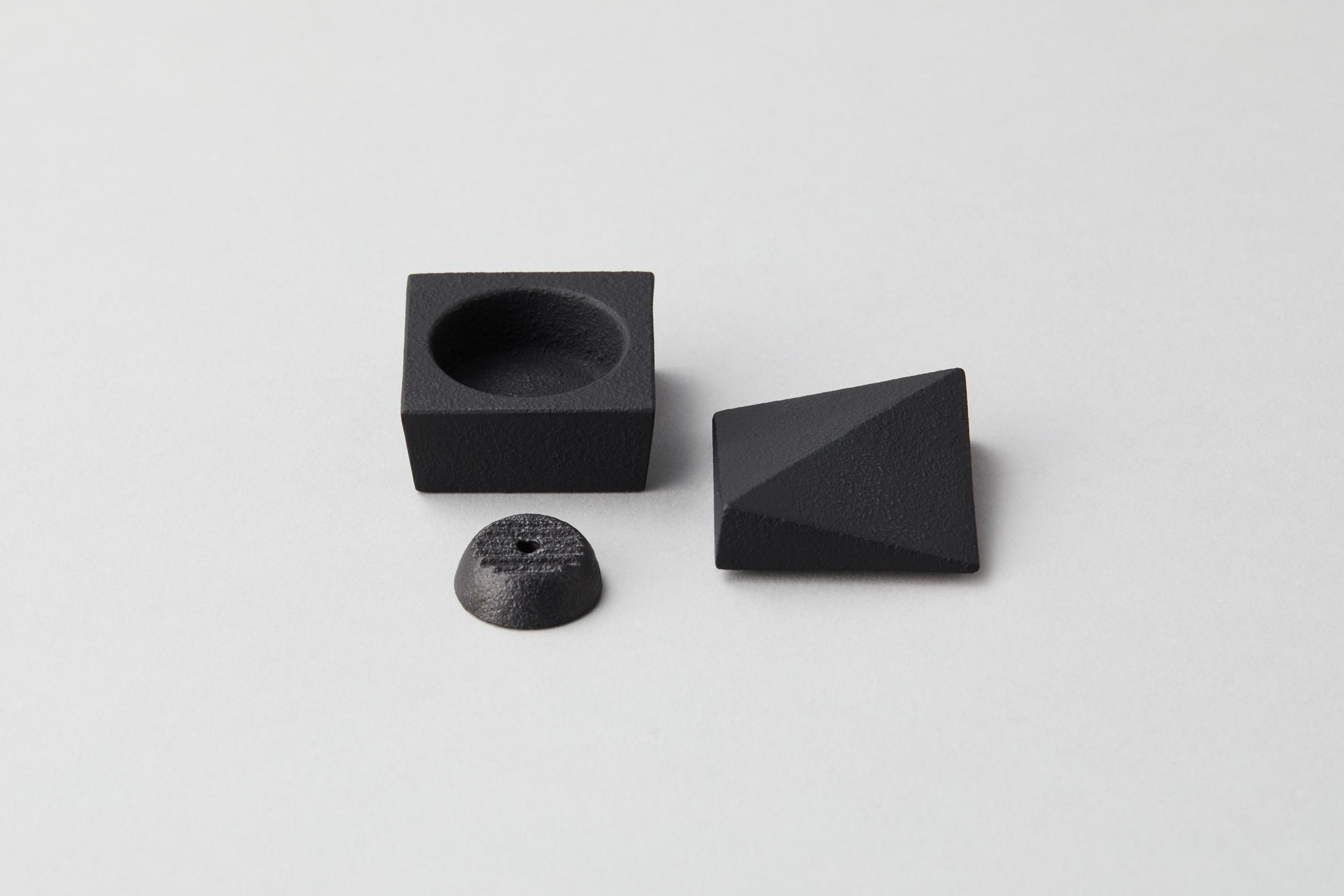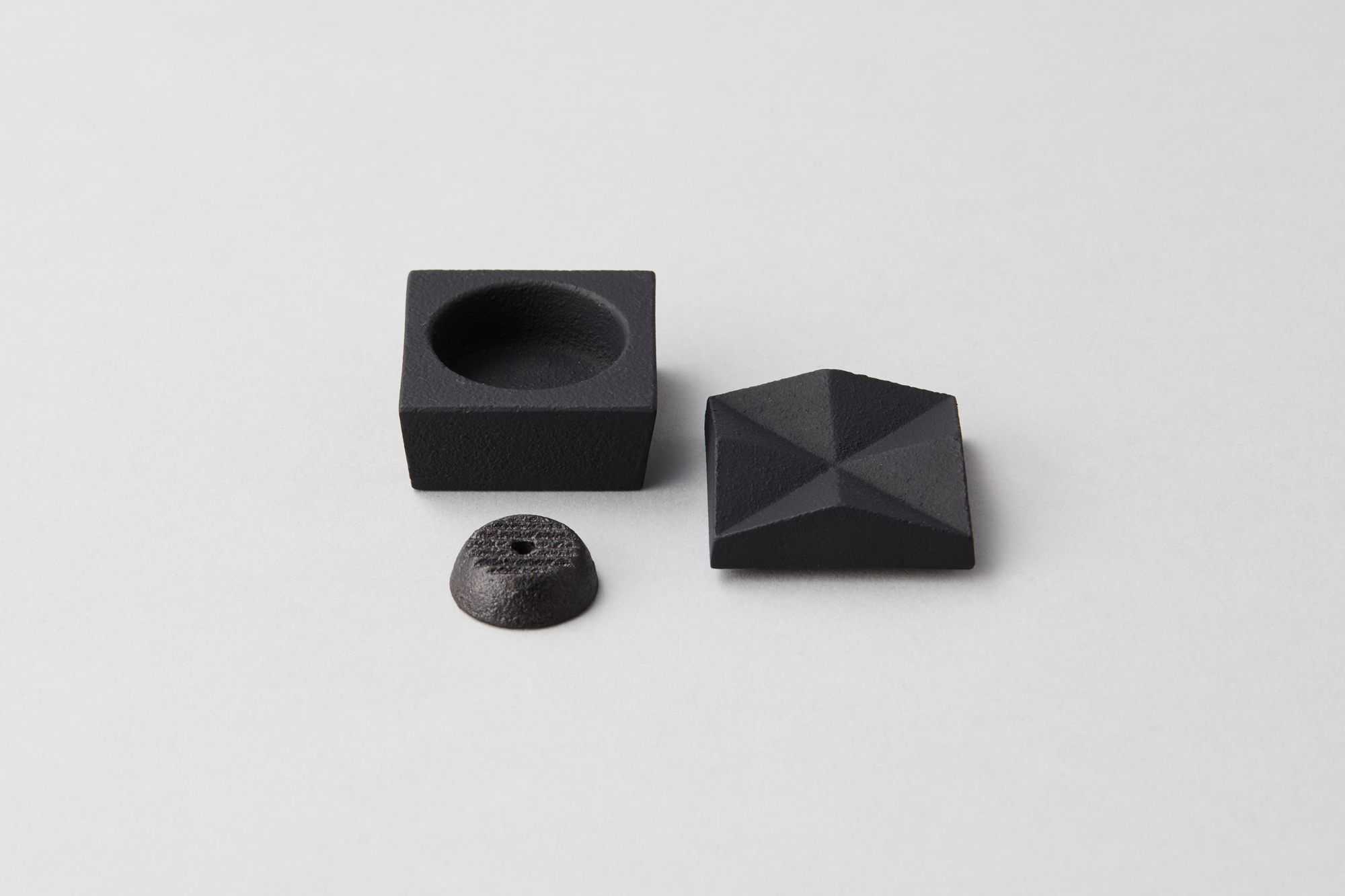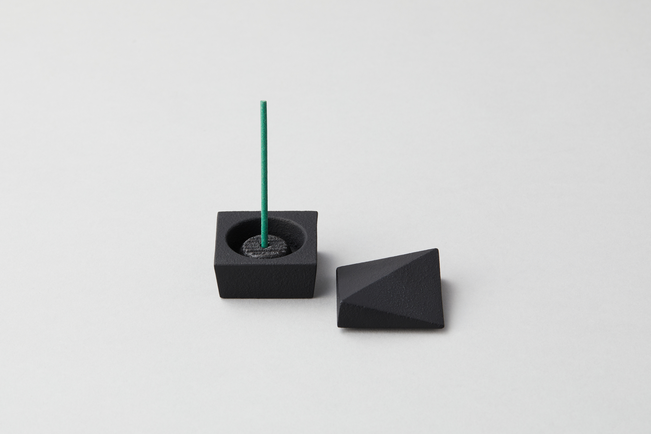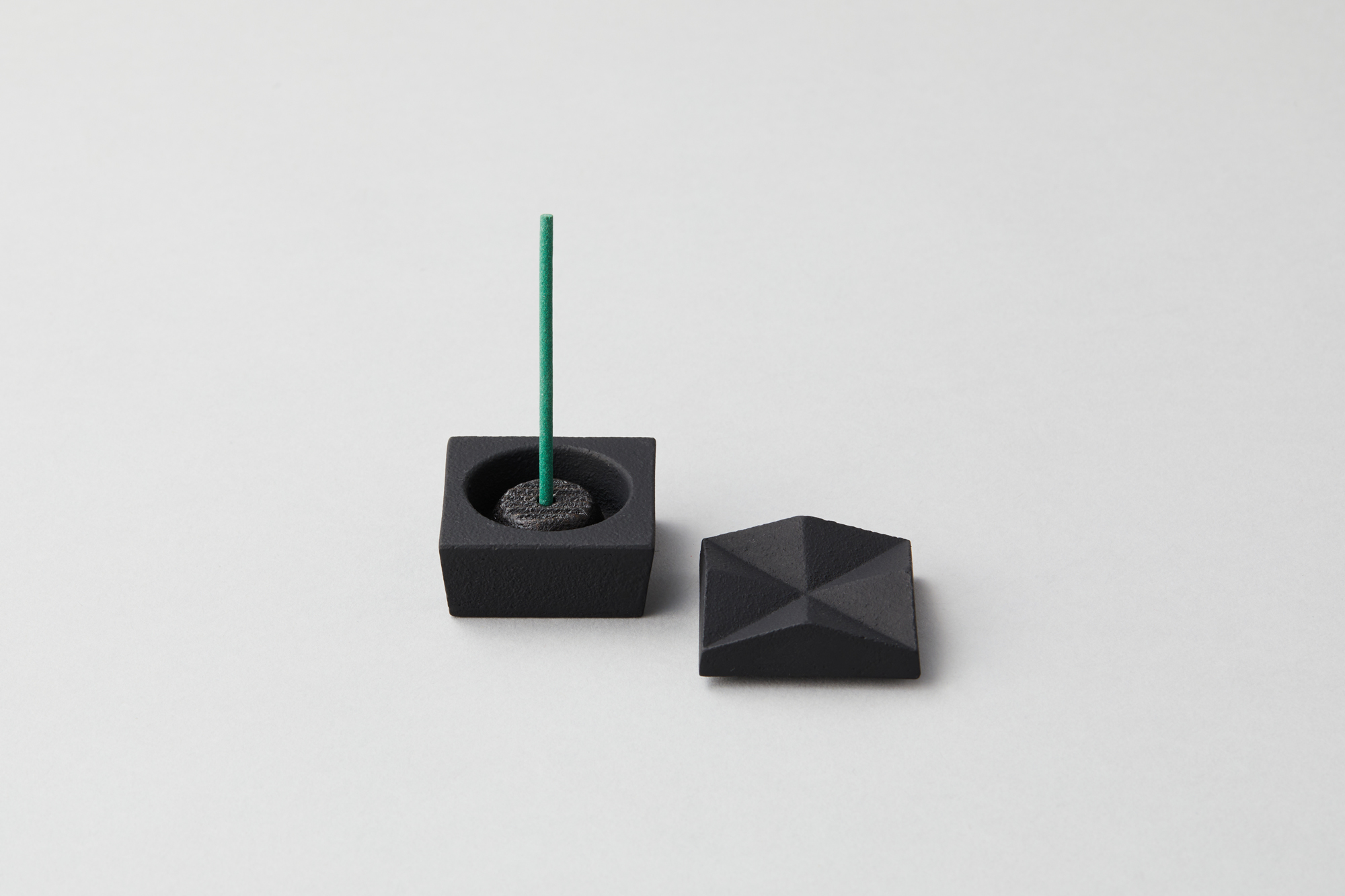 Three shapes were created by cutting a square prism. A two-folded angle with a diagonal cut, a four-folded angle with four corners cut, and an eight-folded angle with eight sections. This incense box is designed to pursue the beauty of its cut surfaces. Remove the lid and